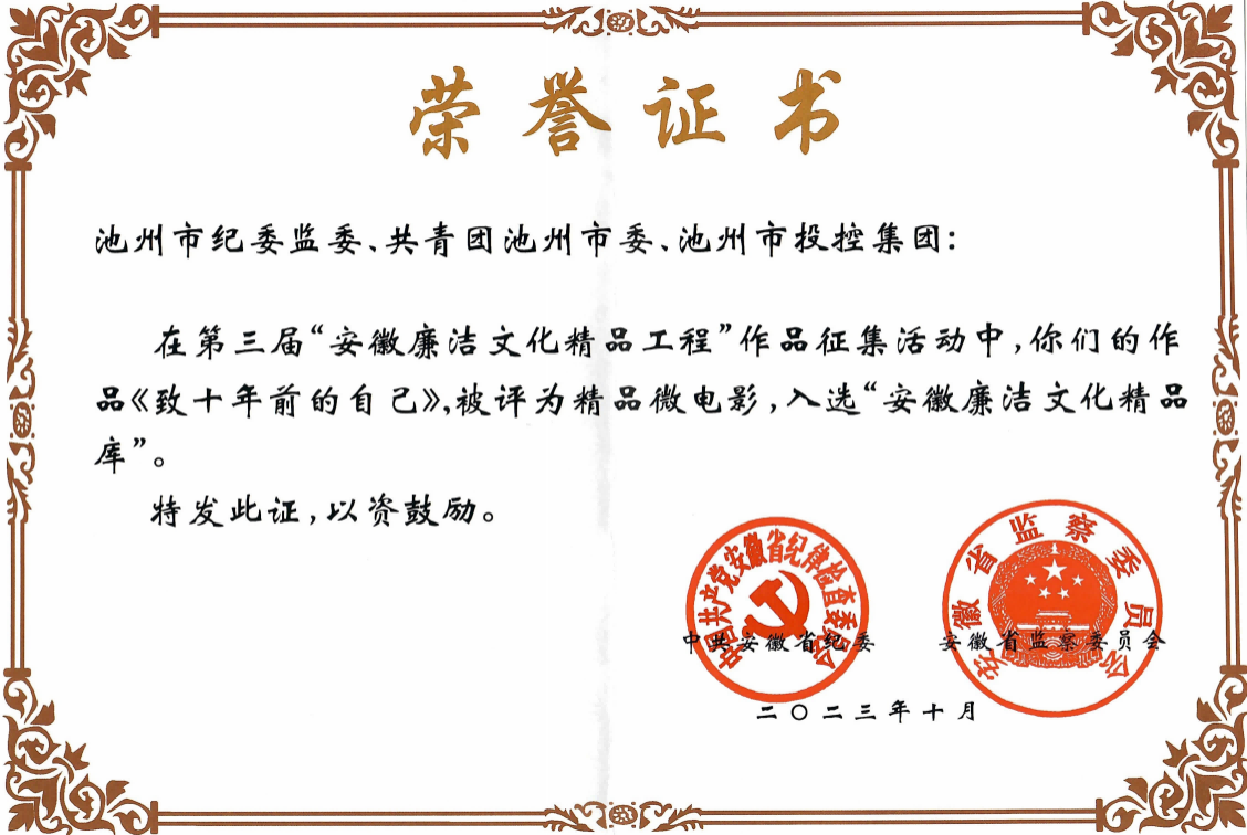 據(jù)悉,在第三屆“安徽廉潔文化精品工程”作品征集活動中,池州市紀(jì)委監(jiān)委、共青團(tuán)池州市委、池州市投控集團(tuán)聯(lián)合攝制的廉潔微電影《致十年前的自己》,被評為精品微電影,入選“安徽廉潔文化精品庫”。