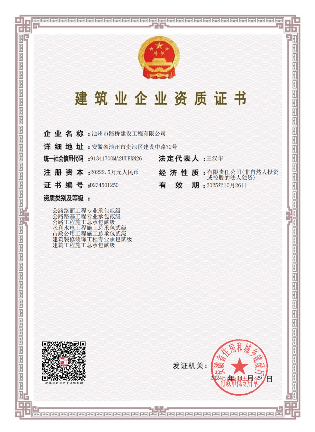 公司發(fā)展四年多,已成功取得建筑工程施工總承包貳級、公路工程施工總承包貳級、市政公用工程施工總承包貳級、建筑裝修裝飾工程專業(yè)承包貳級、公路路面工程專業(yè)承包貳級、公路路基工程專業(yè)承包貳級等資質(zhì)。如今,獲批水利水電工程施工總承包貳級資質(zhì),為公司業(yè)務(wù)板塊拓展了更高更廣的發(fā)展空間。