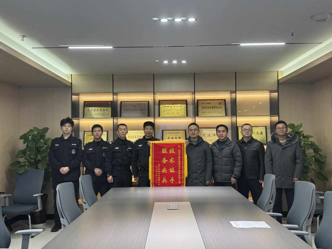 12月10日,池州市公安局特警支隊支隊長陳后剛一行赴設(shè)計總院送來錦旗和感謝信,感謝設(shè)計總院在該局執(zhí)行某專項任務(wù)時給予的裝備和技術(shù)支持,并對設(shè)計總院在支援期間展示的扎實的工作作風(fēng)和過硬的專業(yè)素養(yǎng)表示充分肯定。