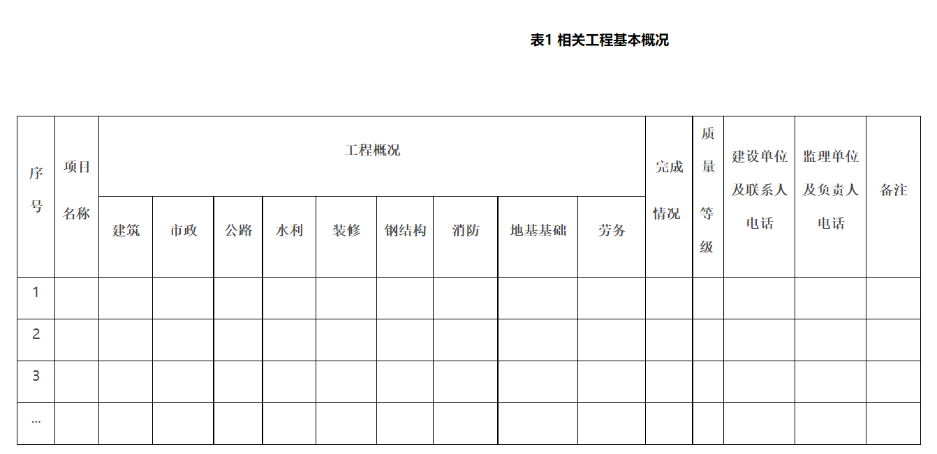 3、各公司根據(jù)本企業(yè)的資質(zhì)范圍,分別填報(bào)相應(yīng)的業(yè)績材料(如房屋建筑、市政工程、公路橋梁工程、水利(電)工程、地基及基礎(chǔ)處理工程等)。(見表1)