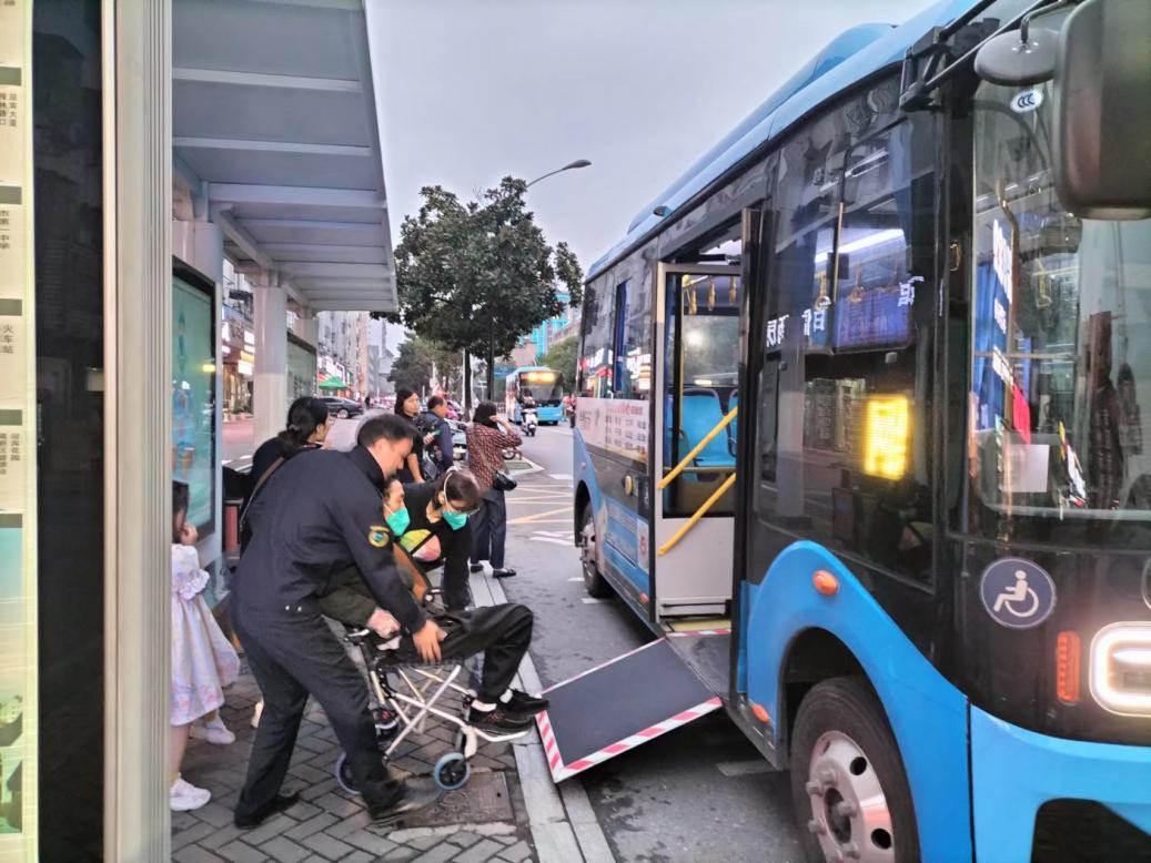 17:46分,金師傅到達(dá)市人民醫(yī)院公交站,停穩(wěn)開(kāi)門(mén)后,章征彥迅速放下無(wú)障礙上下車(chē)踏板,金師傅下車(chē)幫忙將老人推上車(chē),并調(diào)整輪椅位置,確保穩(wěn)固。17:52分,抵達(dá)清溪橋公交站下車(chē)點(diǎn),章征彥和金師傅再次協(xié)助將輪椅老人推下車(chē)。