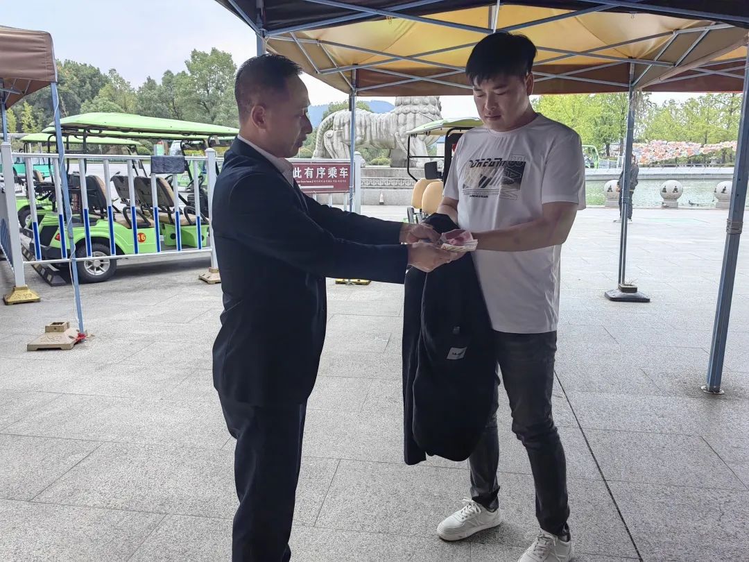 游客胡先生通過景區(qū)工作人員得知自己的外套在觀光車起點站,隨身物品保存完好,十分激動,收到衣物后連聲道謝。趙小平回應稱:“在我們景區(qū),任何一位員工,拾到游客財物都會主動歸還游客的。”